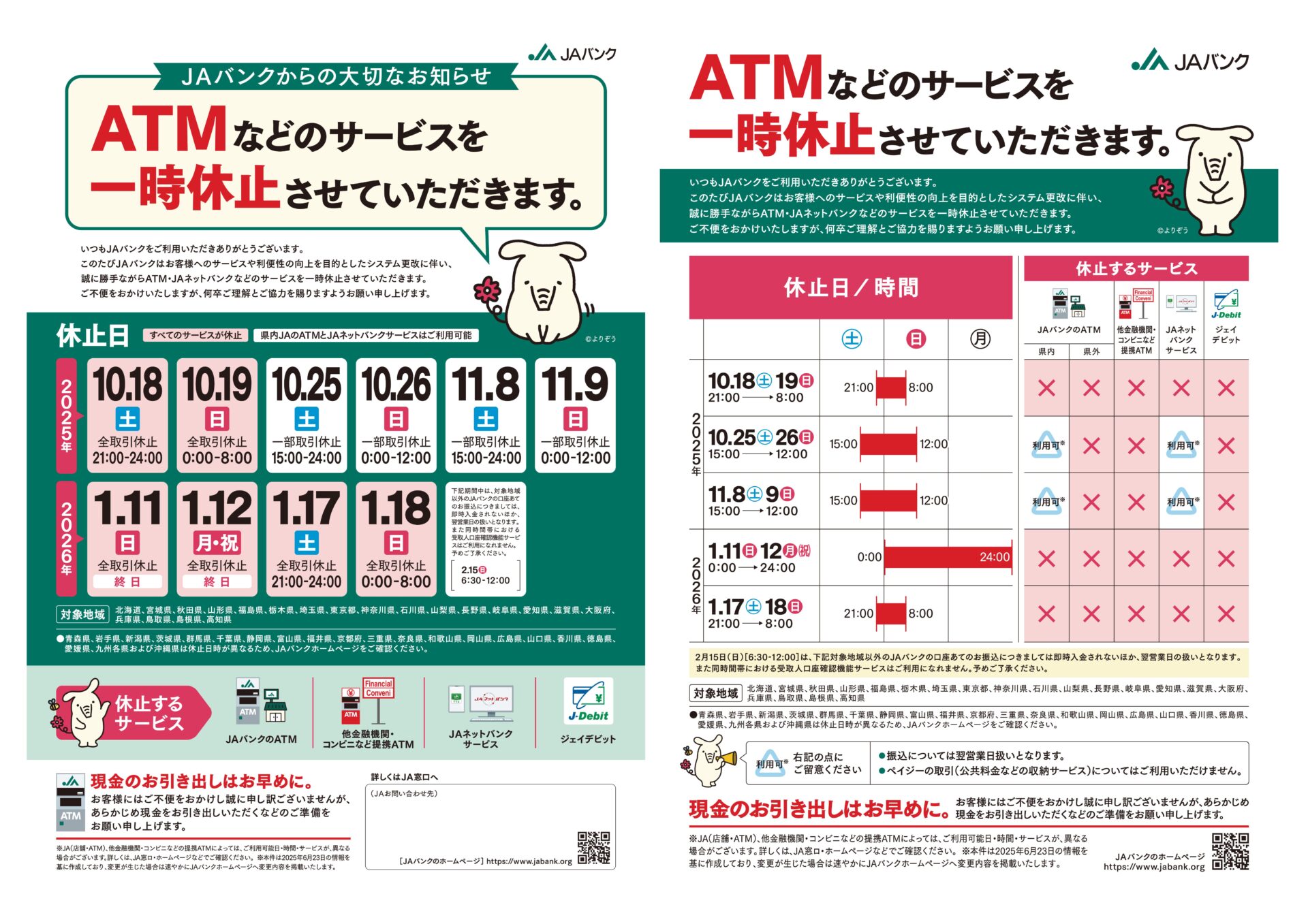 【JAバンクからのお知らせ】ATMなどのサービス一時休止について