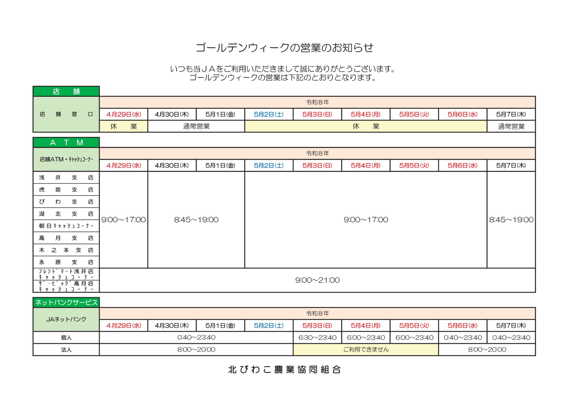ゴールデンウィークの営業のお知らせ