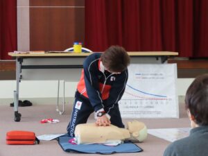 心肺蘇生では、胸骨圧迫の正しい手順とその重要性を確認しました。胸骨圧迫は、止まった心臓の代わりに血液を送り出すための大切な処置であり、時間が経つほど生存率が低下してしまいます。「見ているだけではなく、一歩踏み出すこと」の大切さを、参加者の皆さんは実感されていました。