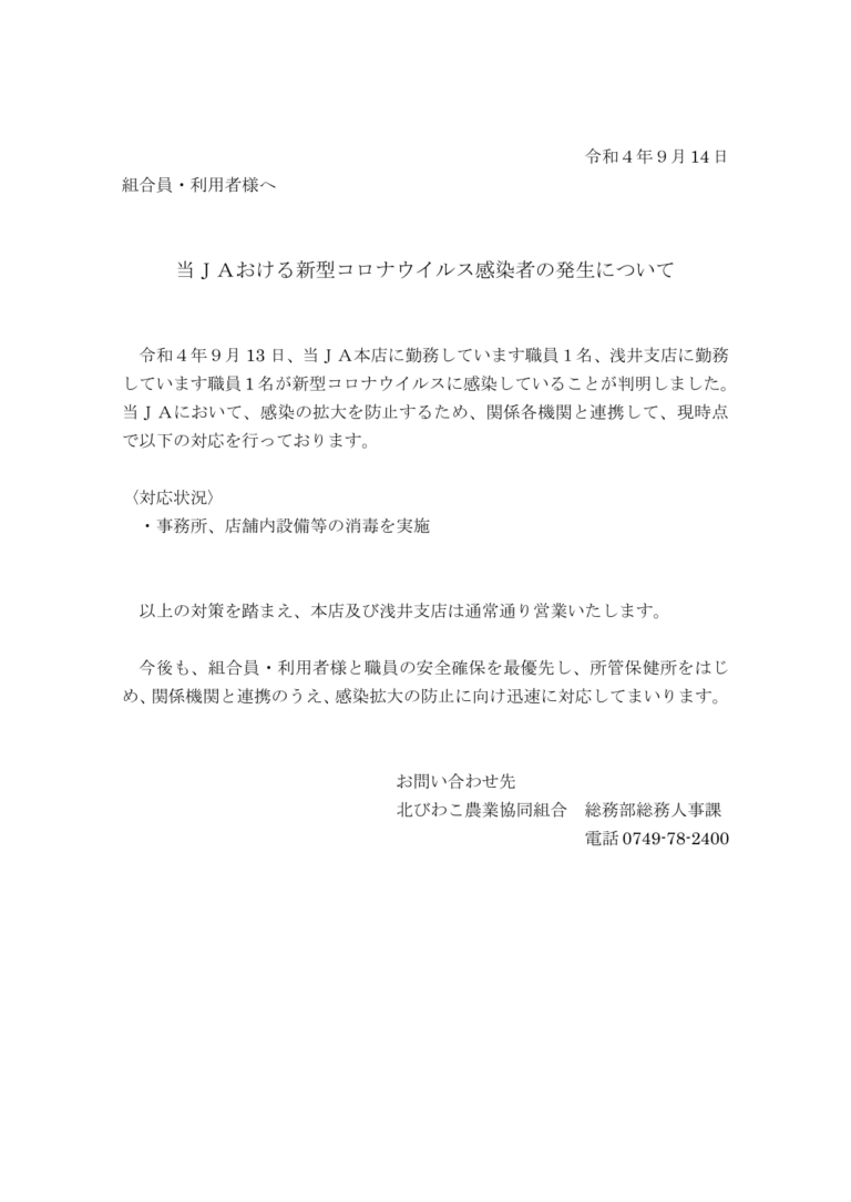 当JAにおける新型コロナウイルス感染者の発生について