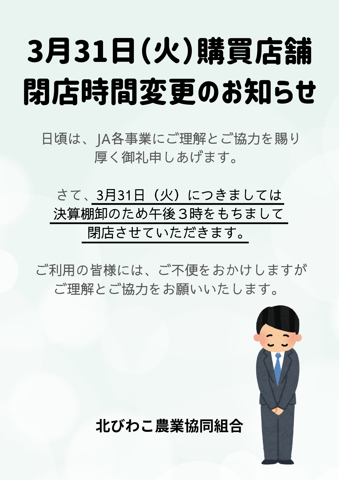 購買店舗閉店時間変更のお知らせ/3月31日(火)