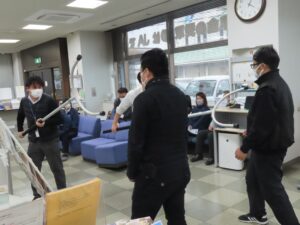 訓練後は、さすまた(佐須股)の使い方を学び、職員が実際に操作を体験しました。また、特殊詐欺の最新手口についての講話もあり、ATMで電話をしながら長時間操作している方への声掛けの重要性など、実践的な知識を深めました。
