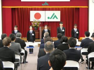 4月1日、本店において令和8年度採用職員の入組式を執り行いました。 今年度は5名の新入職員が新たに仲間に加わり、希望に満ちた表情で職員としての第一歩を踏み出しました。